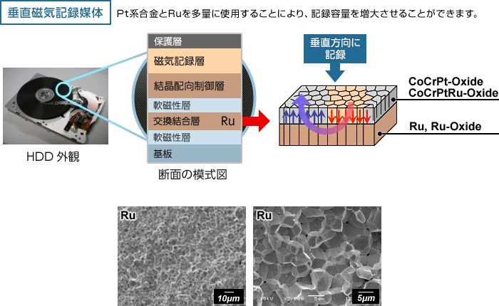 HDD(Hard Disc Drive)を構成する磁気記録媒体や磁気ヘッドには、Pt系合金やRuなど、様々な貴金属薄膜が使われており、特に現行法の垂直磁気記録媒体にはRu薄膜が重要な薄膜として多く使われています。また、”瓦記録方式”や”熱アシスト方式”といった次世代磁気記録媒体でもRuやPt合金膜が期待されております。フルヤ金属では薄膜を形成するためのRuスパッタリングターゲットを中心に、数多くの貴金属ターゲットの製造を手掛けています。