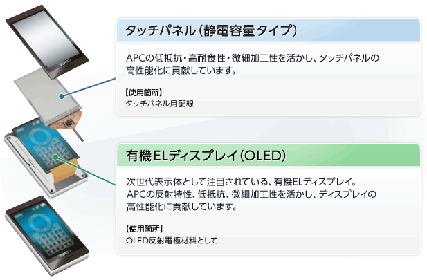 最先端の情報端末として普及したスマートフォン・タブレットPCの高精細ディスプレイとして注目されている有機EL。この有機ELには、APCの優れた低抵抗・高反射・高耐食性・微細加工性が貢献しています。