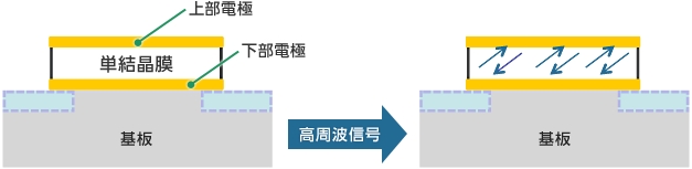 MEMS製品の一部で、圧電性薄膜を電極ではさみ、高周波信号を加えると圧電性薄膜内部を伝わる波(バルク波)が発生し、周波数で共振を起こす素子があります。昨今スマートフォンやタブレットPCの普及により、新たな高速通信デバイスが登場し、電極部材としてPGM材料が使用されています。