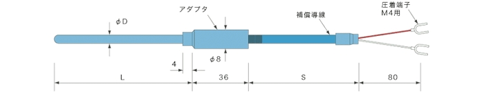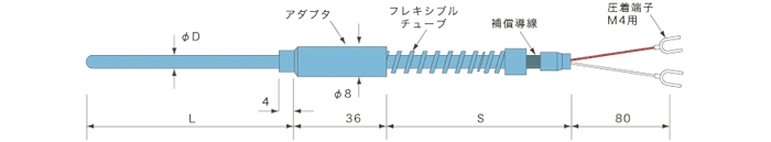 T35型、シース長さ1m、シース径1.6mmφ、素線種類K、接点接地タイプ、シース材質 SUS316、補償導線長さ3m、補償導線種類EXB