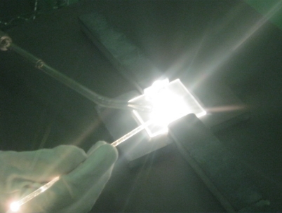 火加工工程では曲げ加工や寸法の調整、石英保護管の先端封じ、パーツの溶接などを行います。石英ノズルのバーナーを使用することで不純物の混入をなくし、純度の高い石英製品を生産します。