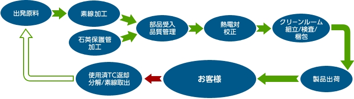 当社はPGM材料を原料から取り扱う加工メーカーです。その強みを活かし、熱電対製品においても素線加工から製品の組立、さらにはお客様がご使用された後の熱電対素線リサイクルまでを手掛けております。リサイクル後の熱電対は精製してお客様の元へ。貴重な資源を最大限に活かし、お客様のご要望にお応えいたします。