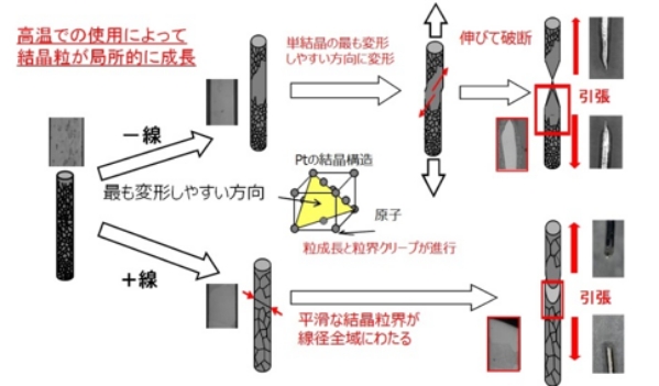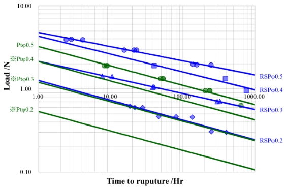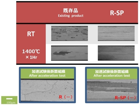 熱電対は一般的に断線するモードとしてクリープ断線が挙げられます。そのクリープで切れるモードを改善したものが、R-SP熱電対です。この熱電対(R-SP)は添加物を入れずにクリープ強度を高めた熱電対です。
