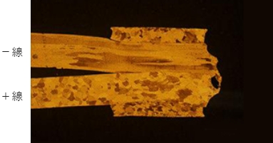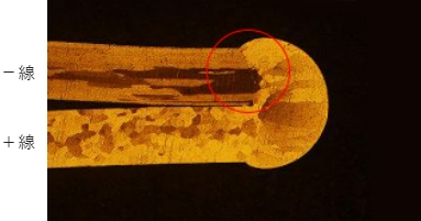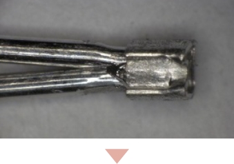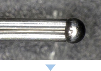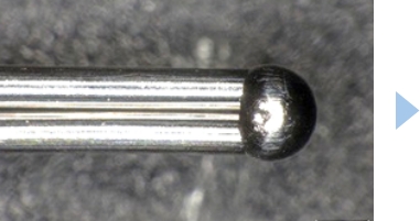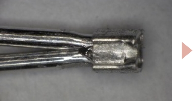 通常の溶接方法を行うと、R-SPの特徴である伸長した組織ではなくなり、強化された効果が薄れてしまいます。そのため溶かし込みを減らし、素線にPt製スリーブを巻き圧着する方法により強化を維持することが可能となっております。